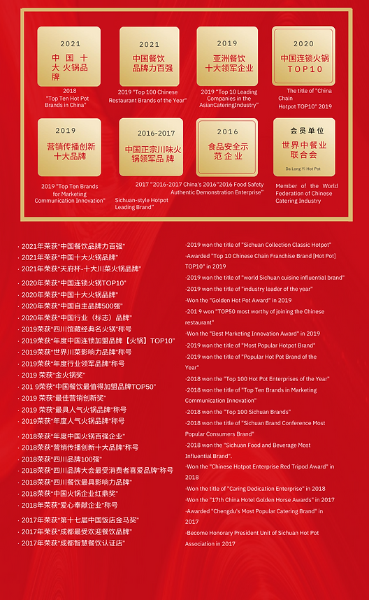 Fundada en 2013 en Chengdu, Sichuan, DaLongYi Hot Pot es hoy una destacada empresa internacional de restauración que lleva el auténtico hot pot de Sichuan a comensales de todo el mundo. Entre nuestras marcas se incluyen «Dalong Shabu Hot Pot», «Dalong Shabu Portable Pot», «Liu Hot Pot», «Pao Bao Po Hot Pot Pickled Vegetables» y otras más. Con el lema «Hot pot para el mundo», hemos expandido nuestra presencia global, abriendo más de 2000 locales y más de 300 franquicias en ciudades como Toronto, Nueva York, Los Ángeles, Seattle, Sídney, Melbourne, Auckland y Singapur hasta septiembre de 2019.